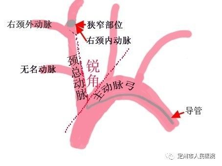 术中,全脑血管造影显示祖大爷的主动脉弓为Ⅲ型,是最复杂的类型,导管需要经过无名动脉才能到达颈动脉狭窄部位,而无名动脉和主动脉弓水平线呈锐角,导引支架的导管硬度大,大大增加了该手术难度。