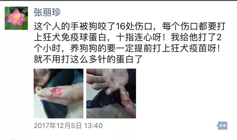 她写道:“这个人的手被狗咬了16处伤口,每个伤口都要打上狂犬免疫球蛋白,十指连心!我给他打了2个小时……”